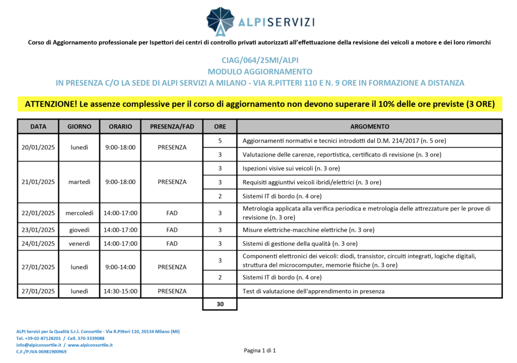 Corso di aggiornamento professionale per Ispettori di revisione obbligatorio per il mantenimento dell’abilitazione. Il percorso formativo è disposto dall’Autorità competente (Direzione Generale per la motorizzazione).